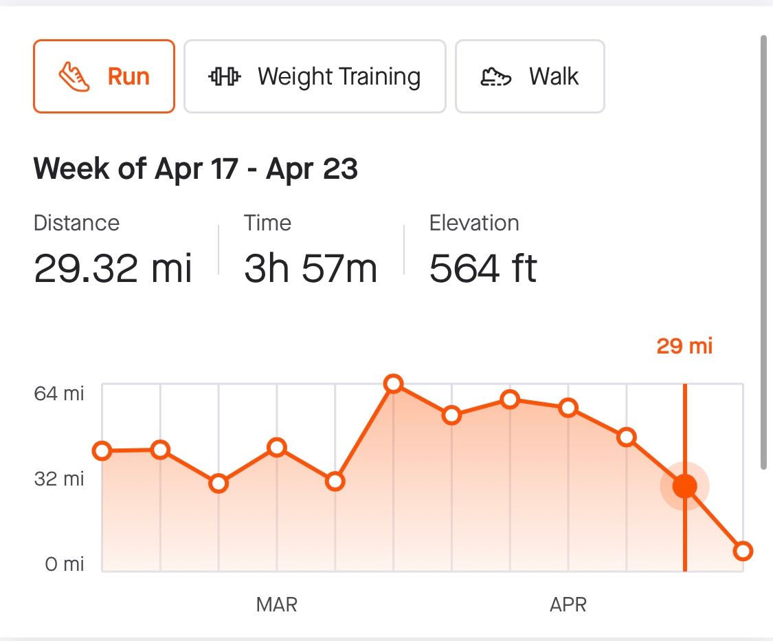 Overall this combination of back-to-back weekend trips led to a training week that felt..desperate? To stay to plan and to appreciate the realities of: 1) having a “race” at the end of the week, and 2 ) how I was feeling mentally and physically day-to-day. I found myself bargaining with my training plan each day, and that itself was stressful. I ended up running 3 of 5 planned runs, totaling 29 miles—a good bit below last week’s 46 miles. I can say confidently, though, that I’m happy with the choices I made through the week, and I got all my highest quality runs in.