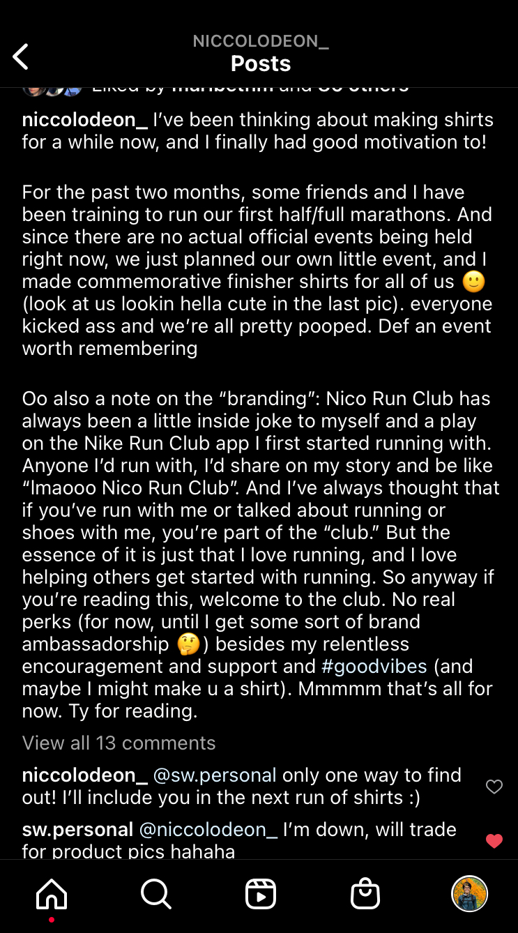 Early on I got in the habit of posting on my Instagram story whenever I ran, and any time I could run with at least one other person, I’d add Nico Run Club in the caption as a little inside joke. Over time, I’d apply that label to different group runs, some organized runs/events among friends, and even some merch that I made :D examples below, and also my first acknowledgement on the branding of Nico Run Club: