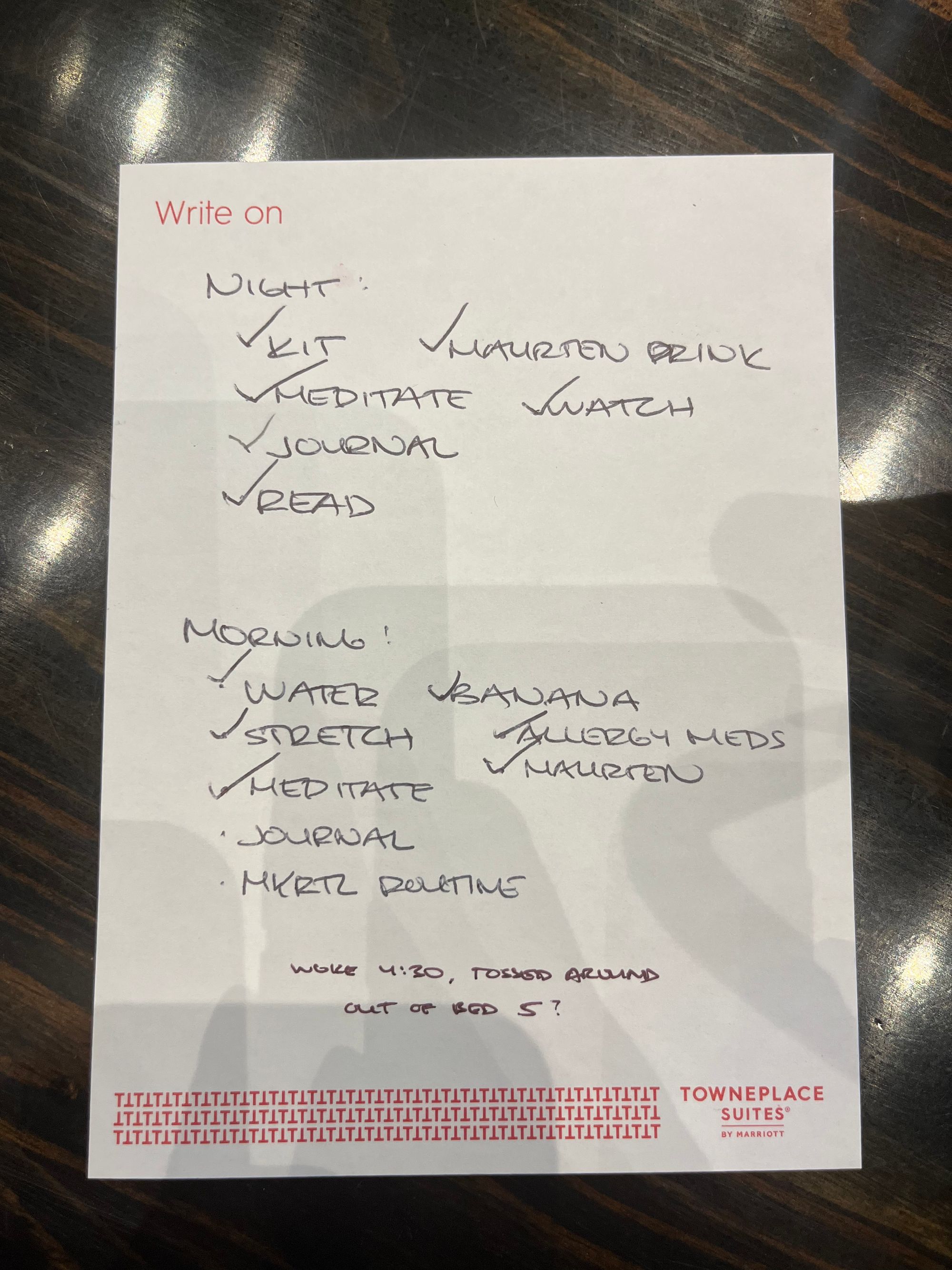 - Run through pre-race routines - By this I’m referring to the things I do the night before the race and the morning of to prep my mind and body for the race. Pictured below is the checklist I made at the hotel of the things I wanted to make sure I did for SDB&B.